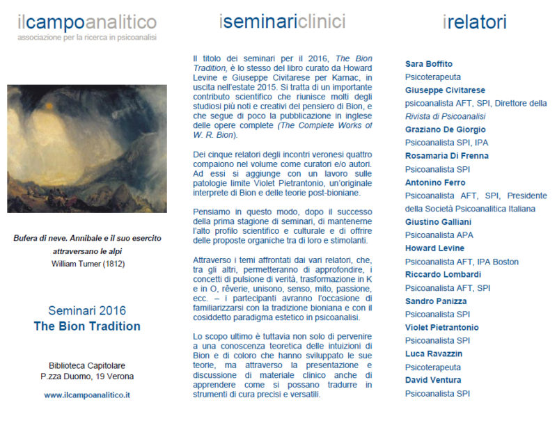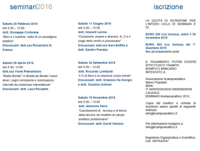 Category: EventiBy Etienne16/05/2019 Author: Etienne Post navigationPreviousPrevious post:Narrazioni psicoanalitiche delle crisi: descrizione, racconto, risoluzione.NextNext post:Seminari aperti 2015Related PostsLe Luci del Campo – Crema08/07/2020Webinar SPI sull’Emergenza COVID-1908/07/2020Webinar sul pensiero di Grotstein e Ferro08/07/2020Seminari aperti 201910/06/2019La psicoterapia dentro il campo relazionale – Crema, 17/01- 18/04 201516/05/2019Seminari aperti 201516/05/2019